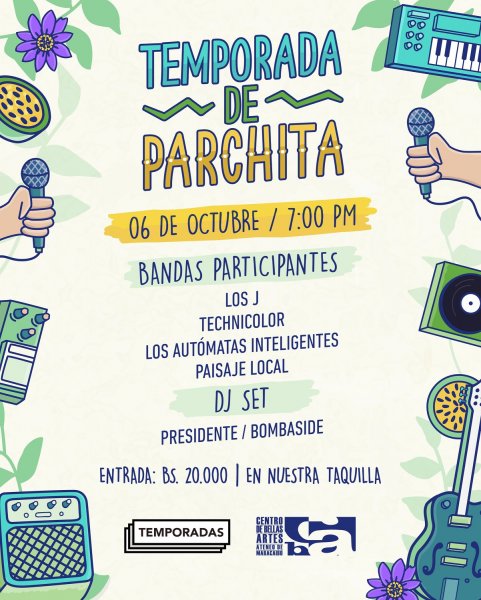 En esta oportunidad toca la «Temporadas de Parchita» y contamos con la presencia de las bandas: «Paisaje Local», «Los Autómatas Inteligentes», «Technicolor» y «Los J» quienes tocarán sus mejores temas en nuestro escenario llenando el aire de mucho Rock y buena vibra. Luego del concierto disfrutaremos de un set de mezcla con tocadiscos de parte de lo DJ’s «Presidente» y «Bombaside».