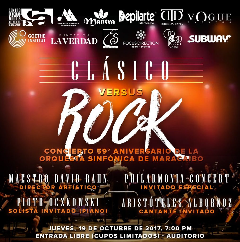 En el marco de su 59 Aniversario, la Orquesta Sinfónica de Maracaibo (Patrimonio Artístico de la Nación) junto al Centro de Bellas Artes presentarán el próximo Jueves 19 de octubre a las 7.00 de la noche el espectáculo «Clásico versus Rock» que será ofrecido al público de forma GRATUITA.