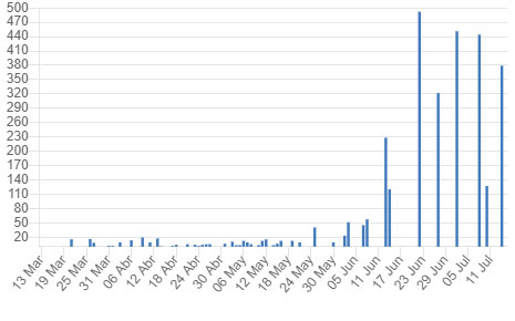 Solo durante junio, el país contabilizaron 4322 contagios entre comunitarios e importados. Las cifras comenzaron a despegar a partir del 17 de junio cuando se reportaron 236 casos. Sin embargo, ese no fue el número más alto. El último día del mes, cerró con 302 personas enfermas con el nuevo coronavirus.