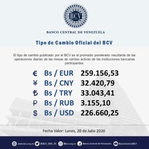 Caracas, DC, Venezuela, 20 de julio de 2020 (ND58).- El Banco Central de Venezuela fijó el precio del dólar de Estados Unidos en 226.660,25 bolívares para este lunes, mientras que la cuenta en Instagram @MonitorDolar estableció la tasa en Bs. 240.496,57 , lo que representa una diferencia de Bs. 13.836,32 con respecto a la jornada de este lunes por la tarde.