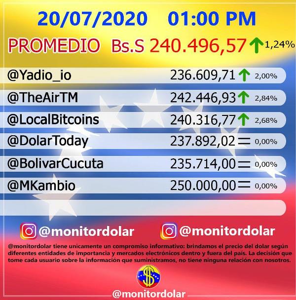 .La moneda extranjera se cotiza este lunes 20 de julio por la tarde en 240.496,57 lo que representa un incremento de 2.935,26 con la tasa fijada la mañana de este lunes.