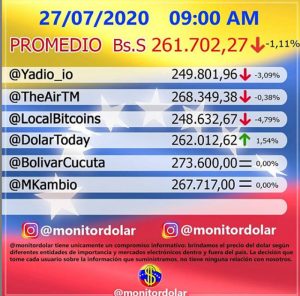 Por su parte, la cuenta Instagram, Monitor Dolar Vzla, ubica el valor de la divisa de Estados Unidos en Bs. 261.702,27, lo que representa una disminución de Bs. 2.925,32; es decir, un 1,11% de menos con respecto a la jornada del viernes 24 de julio.