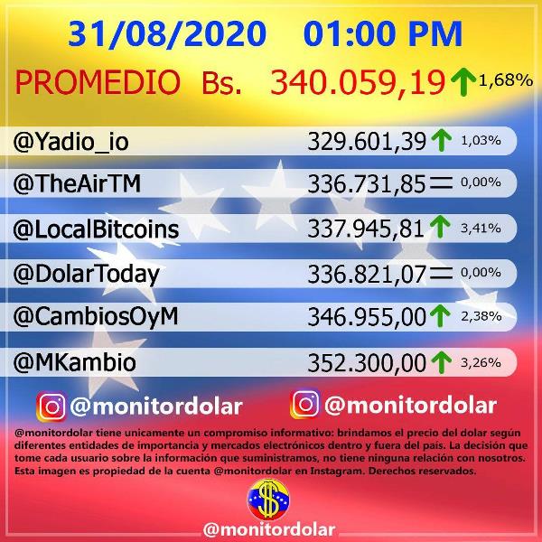 Mientras que la cuenta Instagram, Monitor Dólar Venezuela, indica que el valor de la moneda estadounidense abre la semana en Bs. 340.059,19, lo que representa un aumento en su valor del 1,68 %; es decir, unos Bs. 5.617,70 más con respecto a este lunes en la mañana.