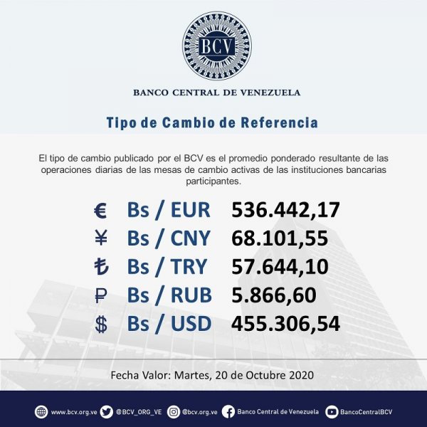 Caracas, DC, Venezuela, 20 de octubre de 2020 (ND58).- Según las operaciones de la mesa de cambio el valor del dólar en Venezuela inicia este 20 de octubre en 455.844,15 bolívares, de acuerdo con información publicada por el Banco Central de Venezuela (BCV) en su portal web.