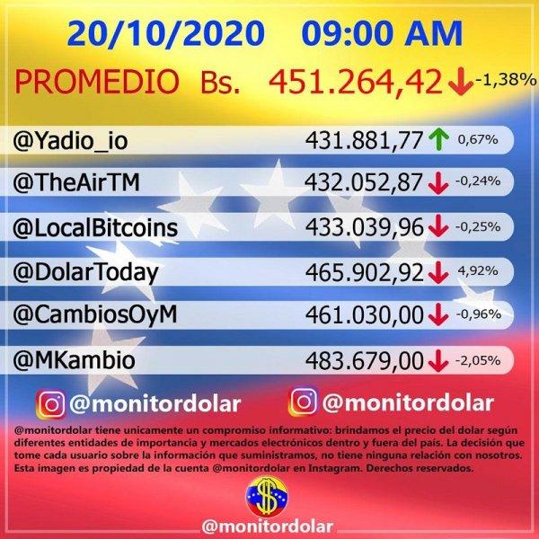 Mientras tanto la cuenta Instagram, Monitor Dólar Vzla, indica que el valor de la moneda estadounidense abre la jornada de este martes en Bs. 451.264,42 lo que representa una disminución de -1,38 % es decir, unos Bs. 6.322,33 menos con respecto a su cotización al cierre de este lunes.