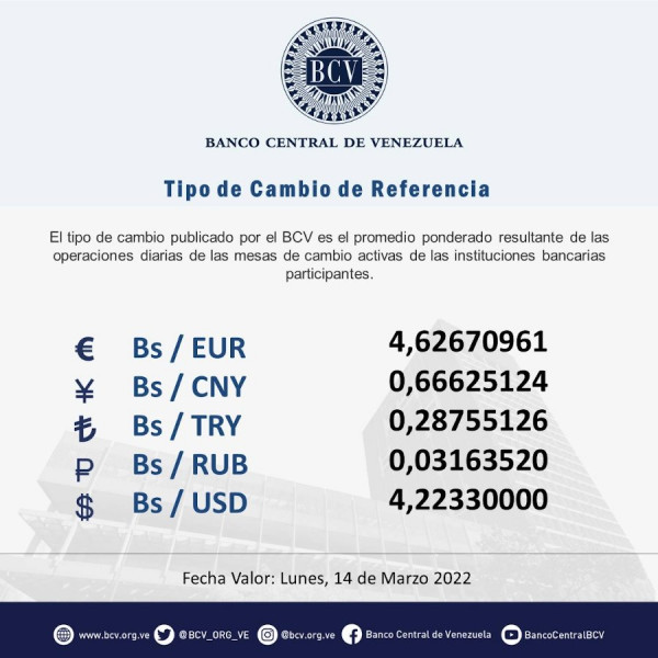 Caracas, DC, Venezuela, 14 de marzo de 2022 (ND58).- Las operaciones de la mesa de cambio oficial indican que el valor del dólar en Venezuela cotiza este lunes en Bs. 4,22 de acuerdo con información publicada por el Banco Central de Venezuela (BCV) en su cuenta Twitter.