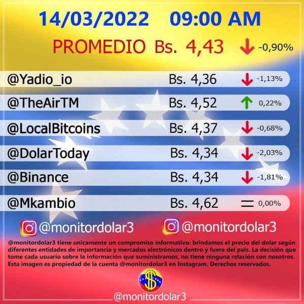 Mientras tanto la cuenta en Telegram, Monitor Dólar Vzla, muestra que el valor de la divisa estadounidense —No Oficial— abre la jornada en Bs 4,43, lo que representa un descenso en su valor de 0.90 por ciento con respecto al precio de la jornada anterior.