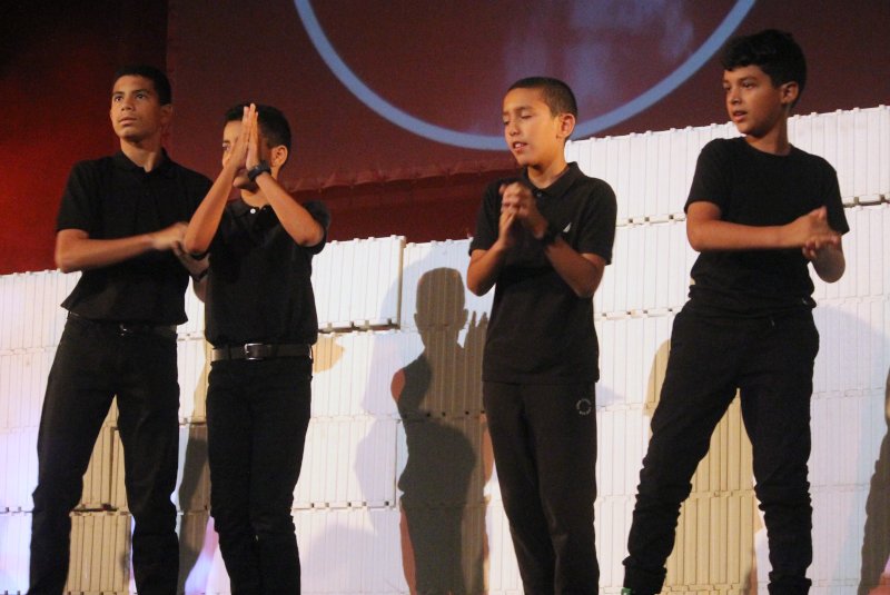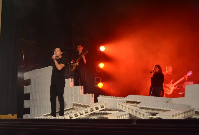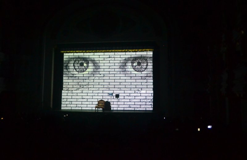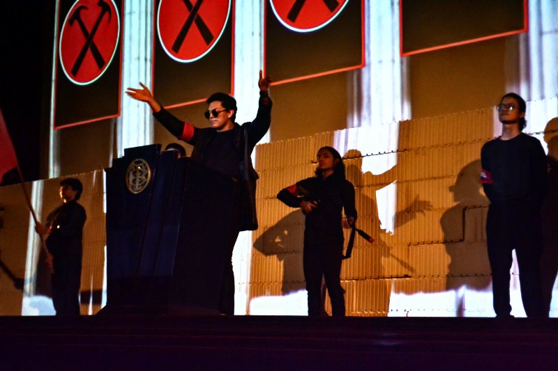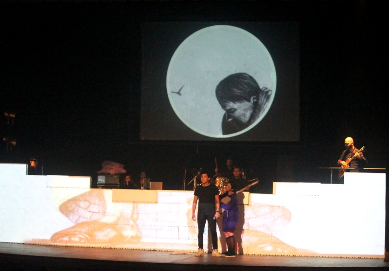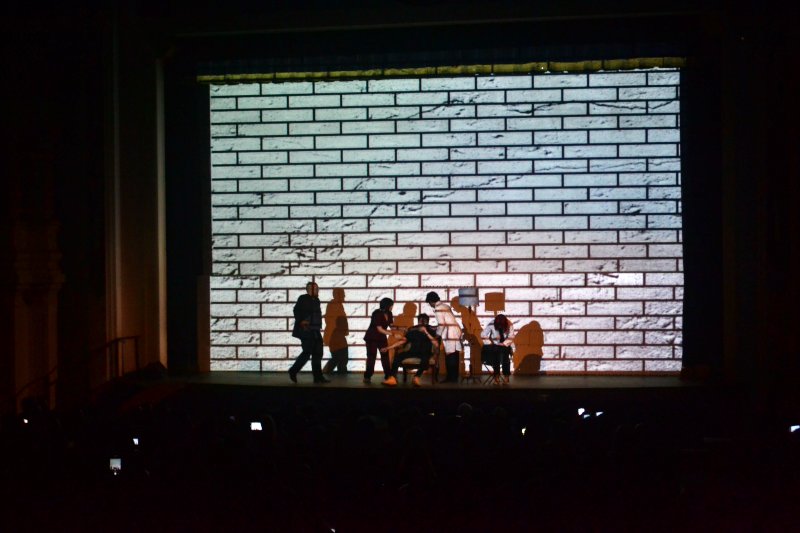 A medida que fue transcurriendo la presentación, los actores fueron construyendo un gran muro alusivo al audiovisual que realizó originalmente, y fueron agregando uno a uno los bloques que conforman los temas del emblemática producción musical inspirada en la vida.