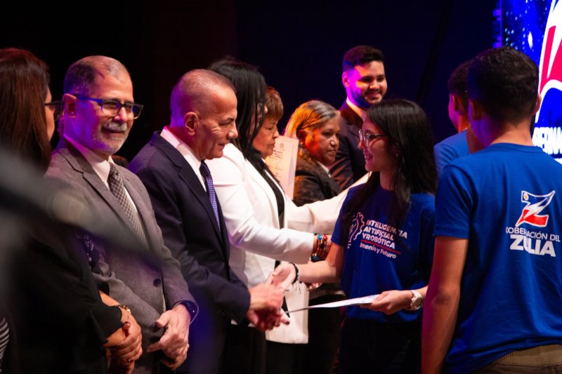 El gobernador recalcó que hoy, 415 estudiantes, de 30 colegios públicos y privados del Zulia, reciben la certificación como Desarrolladores de Robótica e Inteligencia Artificial, avalados por nuestra máxima Casa de Estudios: LUZ.