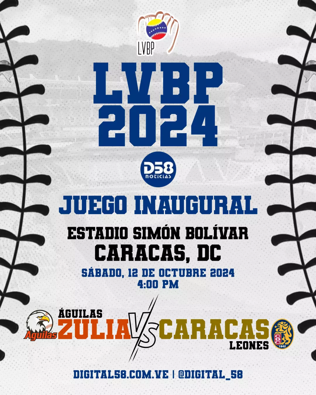 Todo listo para una de las mayores fiestas deportivas de Venezuela, el béisbol profesional, y Noticias Digital 58 desde ya, dice presente para llevarle a través de todos sus canales de difusión la mejor cobertura de Águilas del Zulia y el resto de los equipos en esta nueva temporada en honor a Víctor Davalillo, cómo así lo ha estipulado la LVBP.